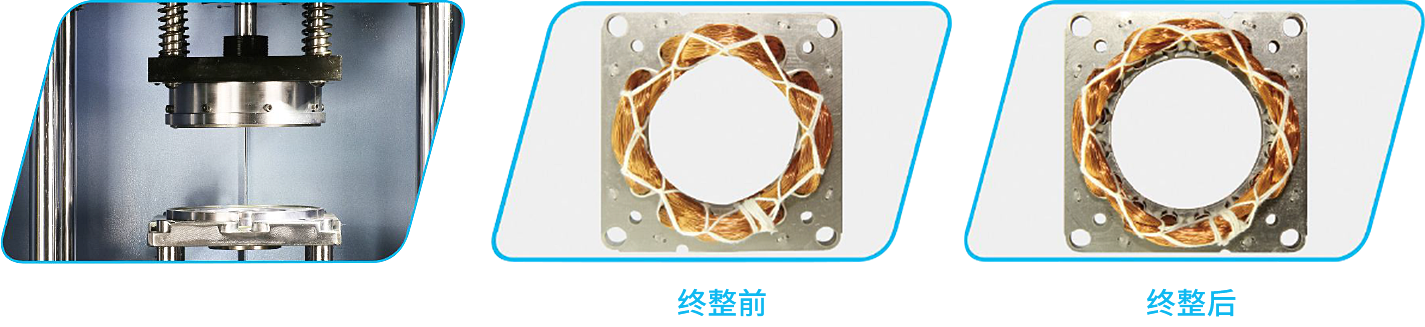 終整形模具:上模內芯擴張、外腔收縮,下模內芯擴張、外墻收縮;對于線圈端部高度壓縮較大的特殊定子線圈,其初整形模具還附帶確保線圈爬電距離的護齒機構;